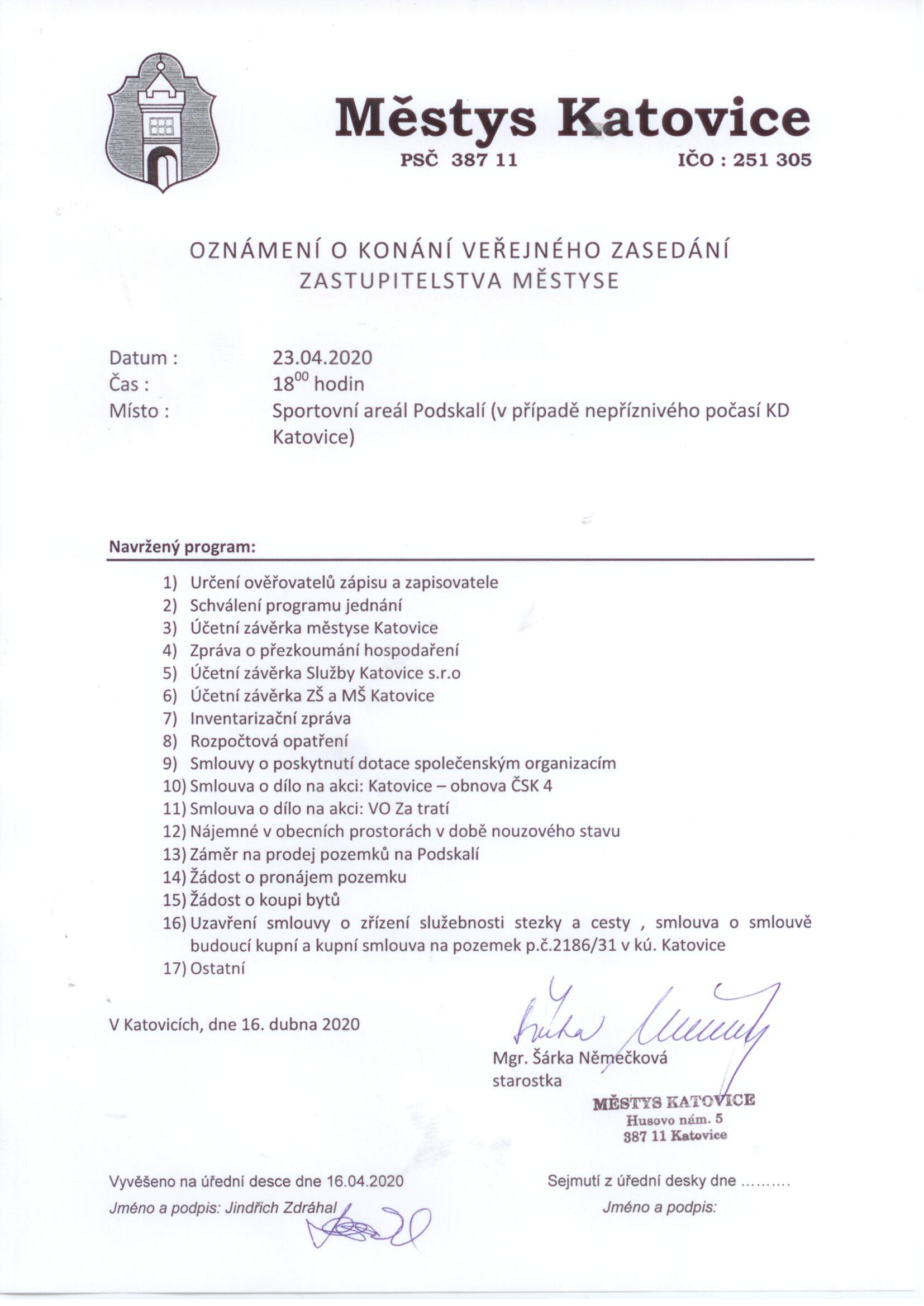 Pozvánka na zasedání zastupitelstva městyse 23.4.2020